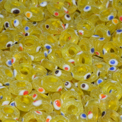 Diese tollen Glasperlen Ringe in gelber Farbe lassen sich in verschiedenste Schmuckstücke integrieren. Sie weisen rote, blaue und schwarze Punkte auf weissem Hintergrund auf.